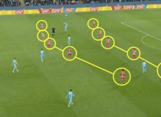 Qëndrimi i theksuar edhe nga Guardiola në fund të ndeshjes. “Ne e ndienim se ata do të mund të luanin 5-3-2, më pas u përshtatën dhe u reshtuan 5-5-0 – tha menaxheri i City -. Në kohët parahistorike, sot dhe pas njëqind mijë vjetësh është shumë e vështirë të sulmosh një 5-5-0, nuk ka hapësira”.