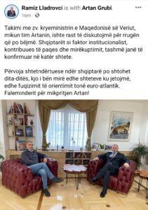 Takimi me zv. kryeministrin e Maqedonisë së Veriut, mikun tim Artanin, ishte rast të diskutojmë për rrugën që po bëjmë. Shqiptarët si faktor institucionalist, kontribuues të paqes dhe mirëkuptimit, tashmë janë të konfirmuar në katër shtete.